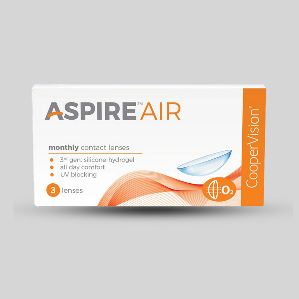 Experience breathable comfort and clear vision with CooperVision Aspire Air monthly contact lenses. Made with 3rd-generation silicone hydrogel material, these lenses allow high oxygen transmission to help keep eyes healthy and comfortable all day. Designed for daily wear, Aspire Air lenses also feature UV blocking to protect your eyes from harmful rays, making them suitable for long working hours and active lifestyles.